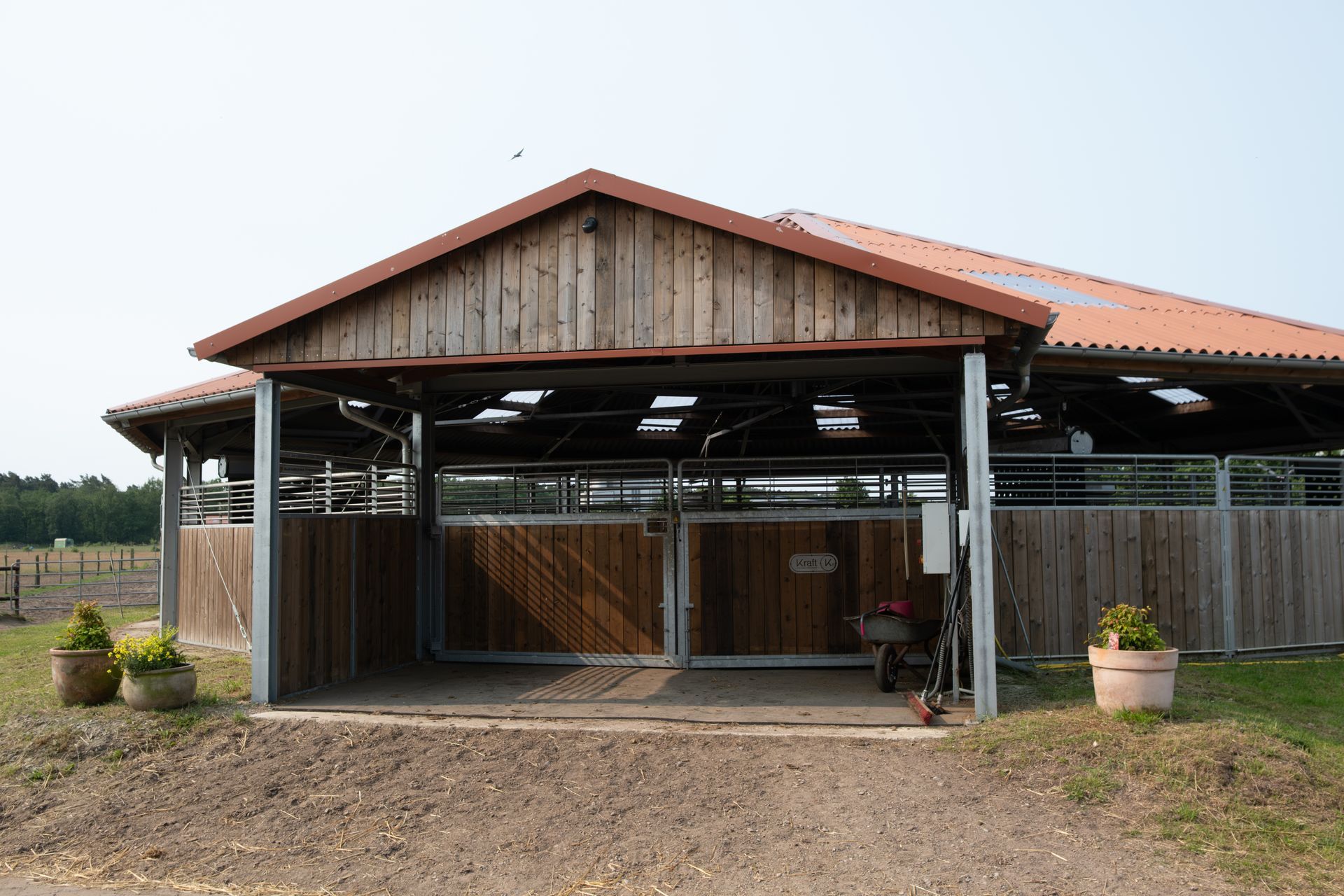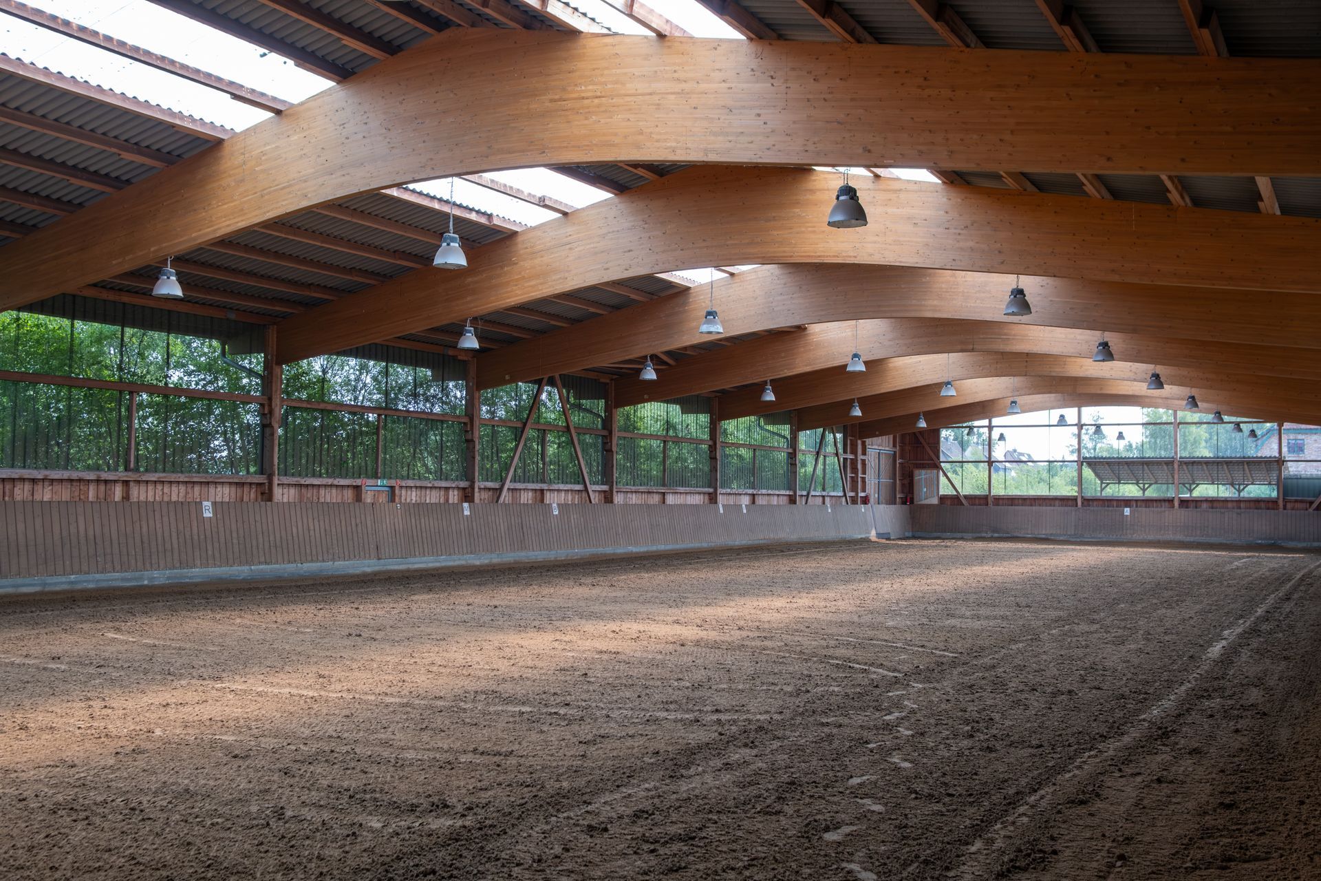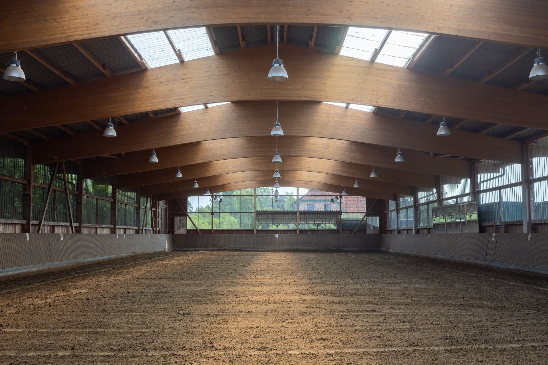 Die 20 × 60 m große Reithalle überzeugt mit Ebbe-Flutboden und Lochblech-Belüftung für ein staubfreies, frisches Klima.