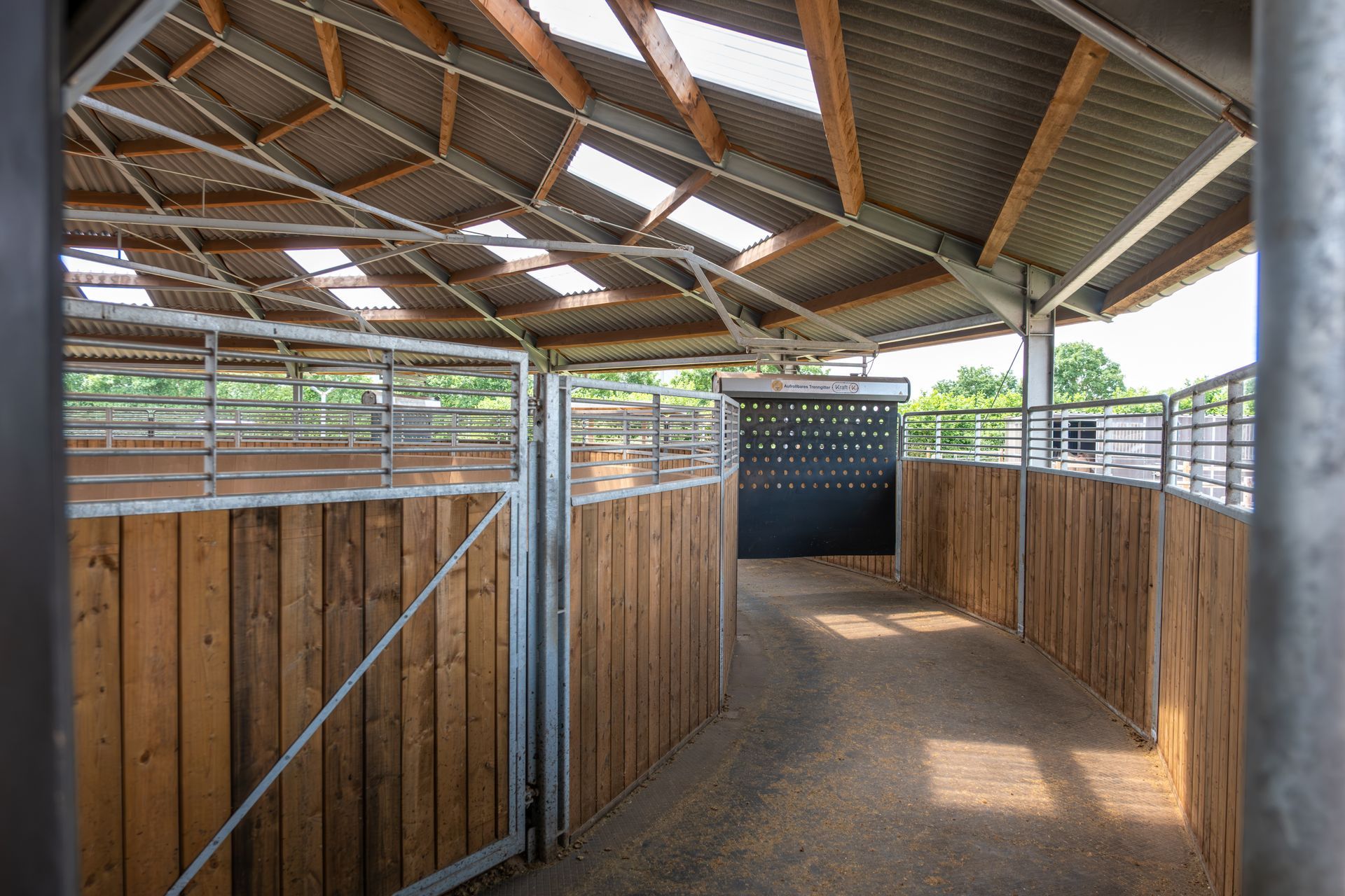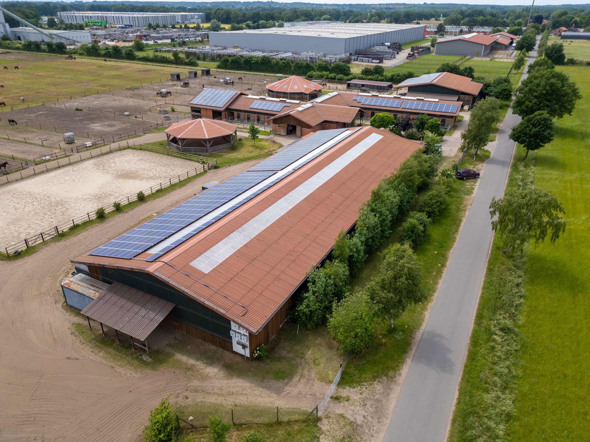 Die 20 × 60 m große Reithalle überzeugt mit Ebbe-Flutboden und Lochblech-Belüftung für ein staubfreies, frisches Klima.